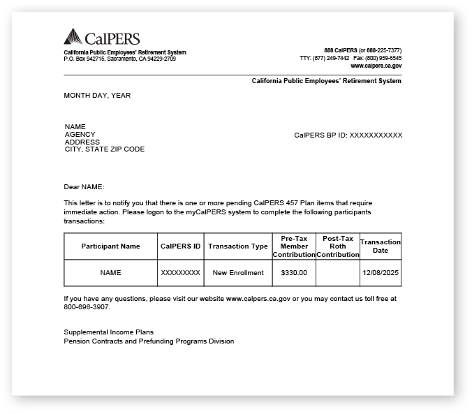 Questions? We want to help. You can call the CalPERS 457 Employer Plan Line at 800-696-3907 or email CalPERS_457_plan@calpers.ca.gov for myCalPERS questions or help with processing enrollments. Email CalPERS_457_plan@calpers.ca.gov to request access to Sponsor Web, which will allow you to view participant and plan level information at any time.
