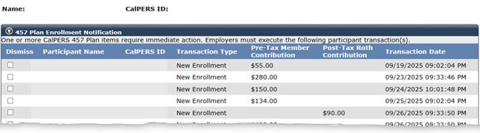 Employers are now notified of enrollments through a pop-up notification when logging into myCalPERS. Employers also receive a letter in lieu of receiving enrollment forms. These notifications capture both online and paper enrollments. If a notification doesn’t include a contribution amount, the enrollment was likely submitted using a paper form. Agencies with regular enrollments may also retrieve a weekly enrollment report through Voya’s Sponsor Web. An enrollment report is posted every Monday and includes all enrollments from the prior week. To request access to Sponsor Web or for questions, please email CalPERS_457_Plan@calpers.ca.gov.